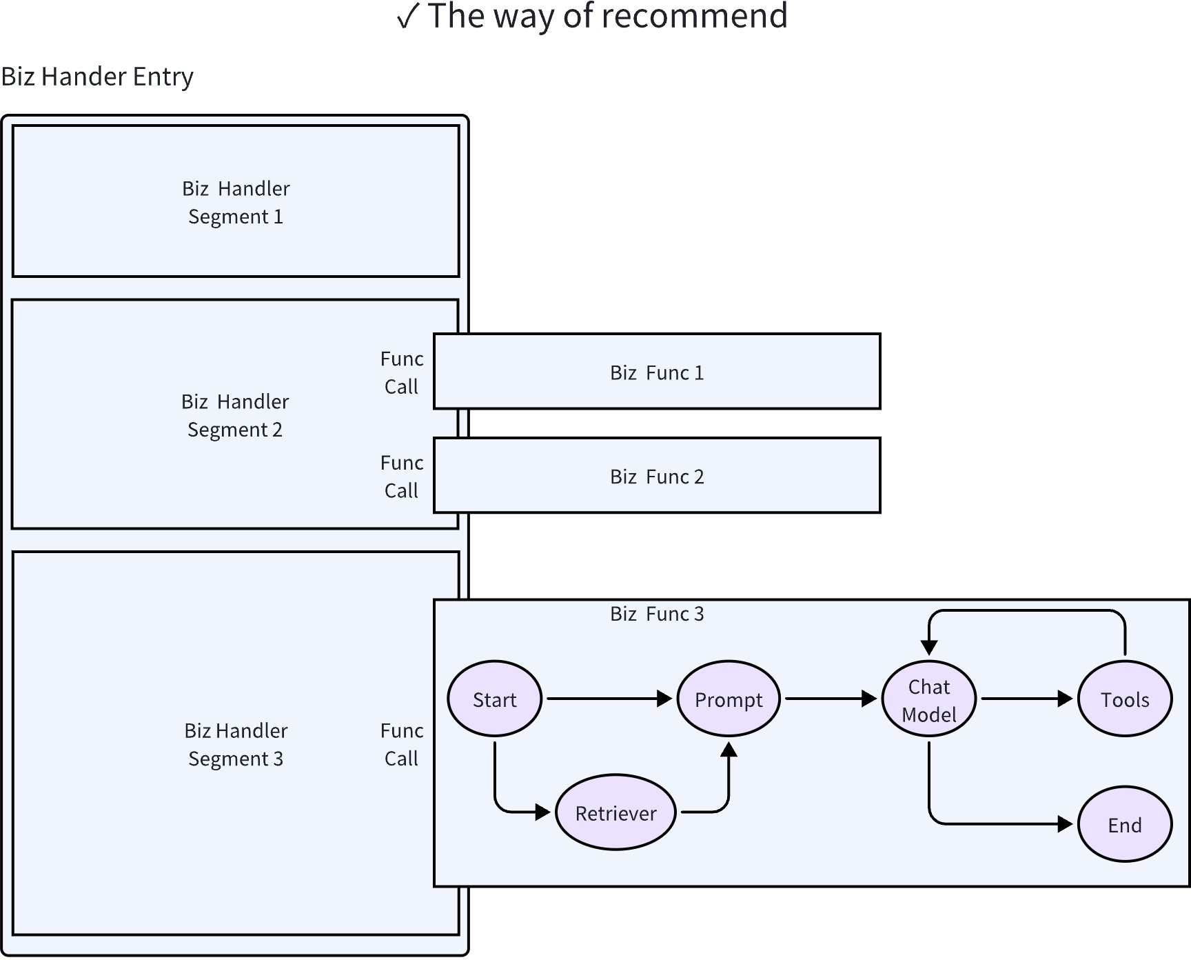 - The logic inside a service interface: Generally speaking, the responsibilities are relatively single, the distribution is relatively concentrated, and the context is relatively cohesive. It does not match the applicable scenarios of “orchestration”. The AI integration component can be used as an SDK in the business interface.
