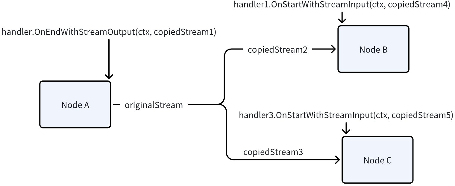 Should you need to transfer information between Handlers, it’s recommended to set a global, request-scoped variable in the outermost context (like the context passed during graph execution) as a public information storage space. You can read and update this public variable as needed in each Handler. For streams, extra attention is needed to ensure the thread safety of this public variable.