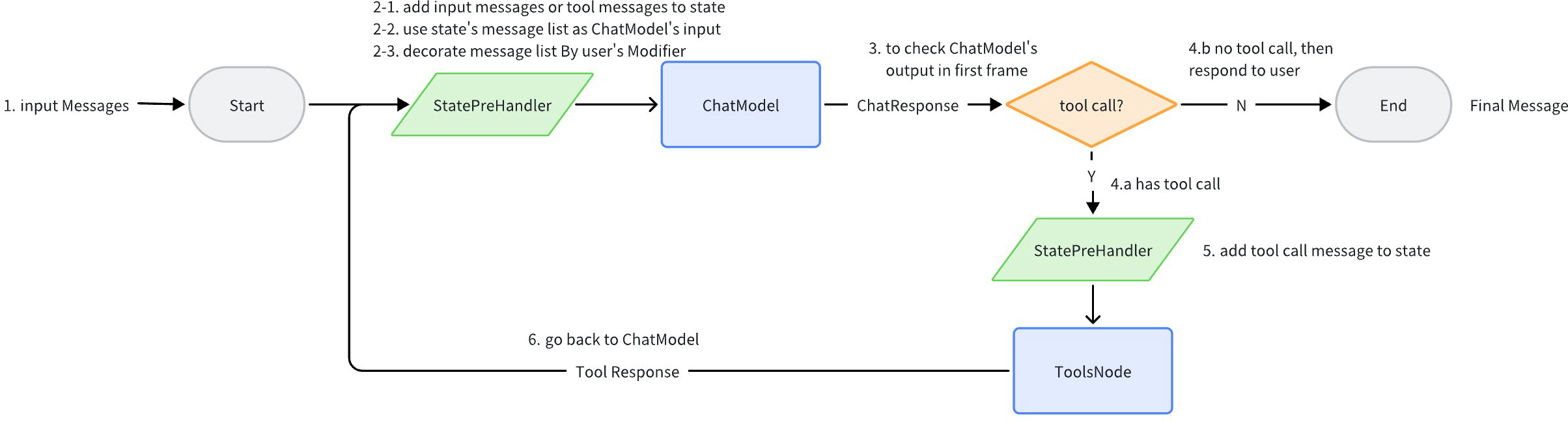 The React Agent uses compose.Graph as the orchestration scheme at its core. Typically, there are 2 nodes: ChatModel and Tools. All historical messages during the intermediate running process are stored in the state. Before passing all historical messages to the ChatModel, the messages are copied and processed by the MessageModifier, and the processed results are then passed to the ChatModel. This process continues until there are no more tool calls in the messages returned by the ChatModel, and then it returns the final message.