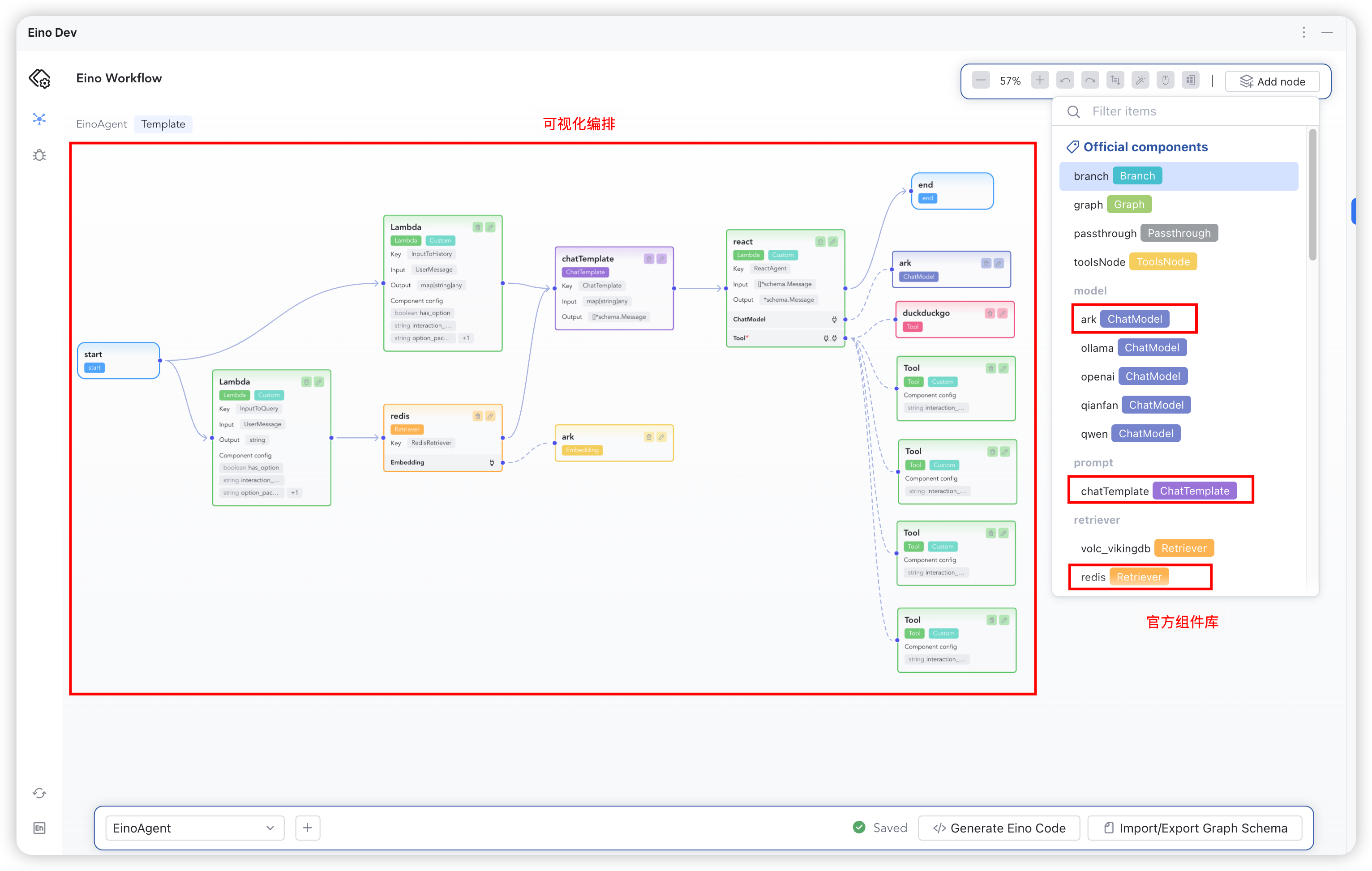 1. Open the EinoDev plugin, navigate to the Eino Workflow page, and create a new canvas. - Graph Name: EinoAgent - Node Trigger Mode: Trigger after any predecessor node finishes - Input Type Name: *UserMessage - Input Package Path: "" - Output Type Name: *schema.Message - Output Import Path: github.com/cloudwego/eino/schema - Leave other fields blank 2. According to the process description in the previous section "**Eino Agent**", select the component library needed from Eino Workflow. The following components are used in this document: - lambda: Converts any developer function func(ctx context.Context, input I) (output O, err error), into an orchestrable node. In EinoAgent, there are two conversion scenarios: - Converts *UserMessage messages into a map[string]any node for ChatTemplate - Converts *UserMessage into the input query for RedisRetriever - retriever/redis - Retrieves and returns context related to the user Query based on semantic relevance from the Redis Vector Database, in the form of schema.Document List. - prompt/chatTemplate - Constructs a Prompt template using string literals, supporting text and message placeholders, and converts any map[string]any input into a Message List that can be directly input into the model. - flow/agent/react - Based on the ChatModel provided by the developer and callable toolsets, automatically decides the next Action in response to user queries until a final answer can be generated. - model/ark - The Ark platform provides LLMs capable of completing conversational texts, such as the Doubao model. This acts as a dependency injection for the ReAct Agent. - Callable tool list - Internet search tool (DuckDuckGo), EinoTool, GitClone, TaskManager, OpenURL 3. Arrange the selected components according to the desired topology. After arranging, click "Generate Code" to the specified directory. - In this example, the code for the "**Eino Agent**" is generated to: eino/einoagent - This example can quickly be constructed by copying the Graph Schema from eino/eino_agent.json![]() | ![]() |
