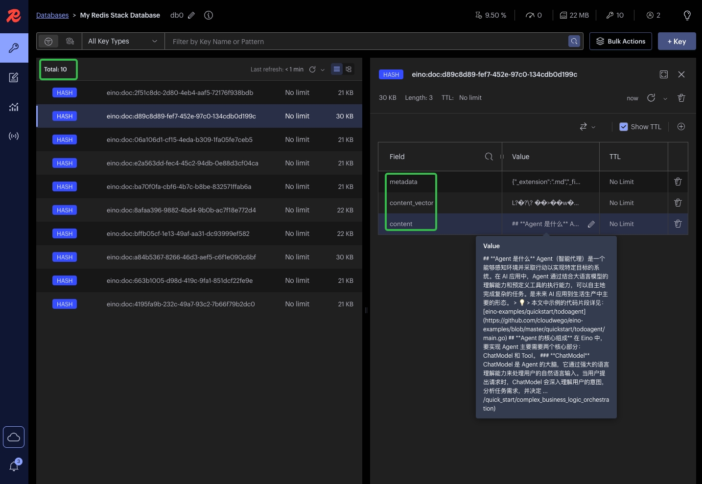 cd xxx/eino-examples/quickstart/eino_assistant # 进入 eino assistant 的 example 中 # Modify the required environment variables in .env (LLM information, trace platform information) source .env # As the example Markdown file is stored in the cmd/knowledgeindexing/eino-docs directory, and the code specifies the relative path eino-docs, you need to run the command in the cmd/knowledgeindexing directory cd cmd/knowledgeindexing go run main.goOnce the execution is successful, the construction of the Eino knowledge base is completed, and you can see the vectorized content in the Redis Web UI.