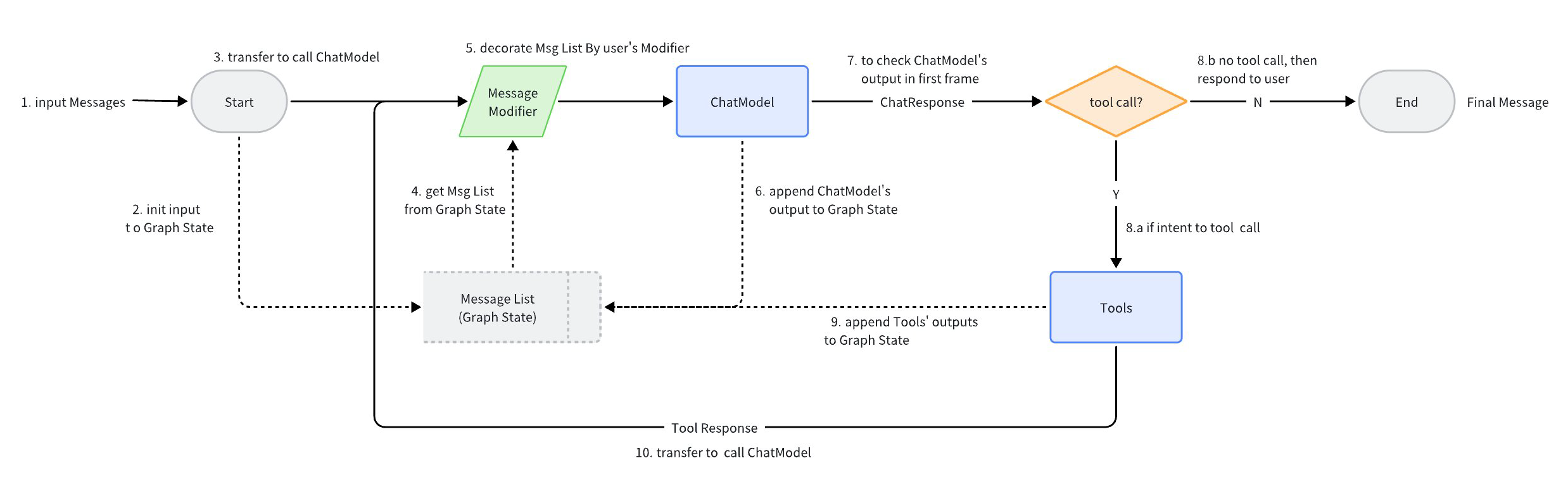 Taking ReAct Agent as an example: a ChatModel (large language model) is “bound” to Tools, receives input Messages, and autonomously decides whether to call Tools or output final results. The Tool execution results become Messages fed back to the ChatModel, serving as context for the next round of autonomous decision-making.