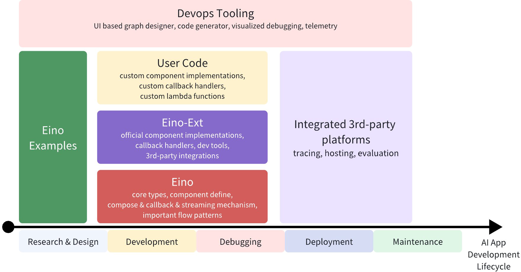 Have you ever felt this way: wanting to add LLM capabilities to your application but not knowing where to start in this relatively new field; wanting to stay at the forefront of research and apply the latest industry achievements, but using an application development framework that hasn’t been updated for months; trying to understand Python code in your project, needing to repeatedly check context to confirm a variable or parameter type; unsure whether the model-generated results are good enough and hesitant to use them; needing to explore and learn additional tools for necessary aspects beyond development like debugging, tracing, and evaluation. If so, welcome to Eino! As a LLM application development framework aimed at covering the entire devops process, Eino has the following characteristics: